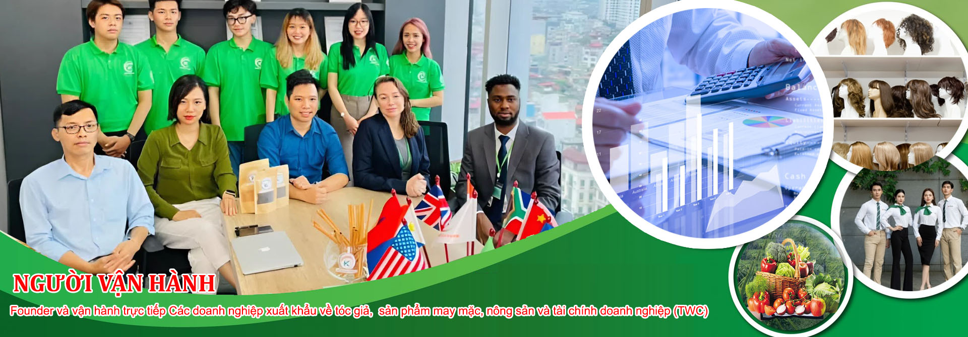 Founder và vận hành trực tiếp Các doanh nghiệp xuất khẩu về tóc giả, sản phẩm may mặc, nông sản và tài chính doanh nghiệp (TWC)